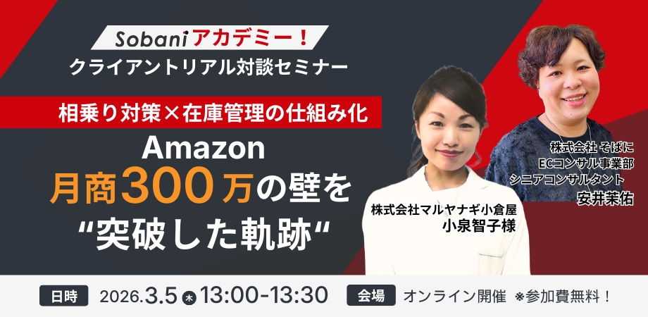 【3/5開催!】【そばにクライアントリアル対談セミナー】 卸売メーカーの「Amazon300万円の壁」を突破。 1年で売上2.5倍、利益の柱へ育てた選択と集中の戦略。 オーガニック豆ブランド「だいずデイズ」が実践した、相乗り対策と在庫管理の仕組み化