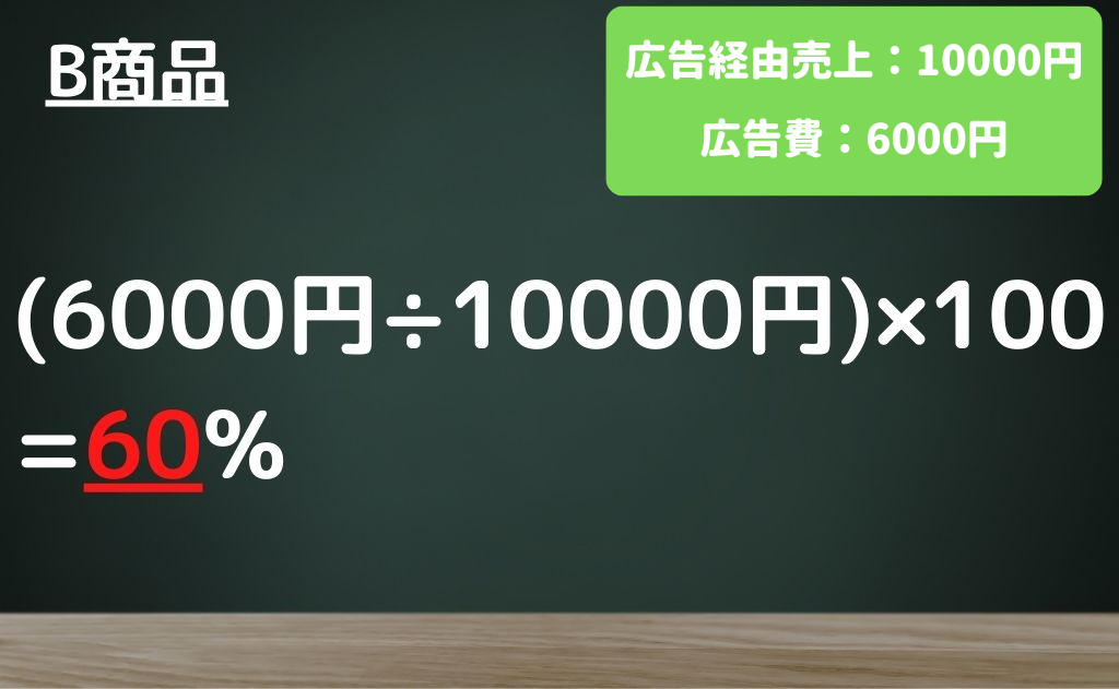 A商品は広告費を500円しか使っていないのに8000円売り上げているので、ACoS6.25%ですが、B商品は広告費を6000円使って、10000円売上をあげているので、ACoS60%となります。