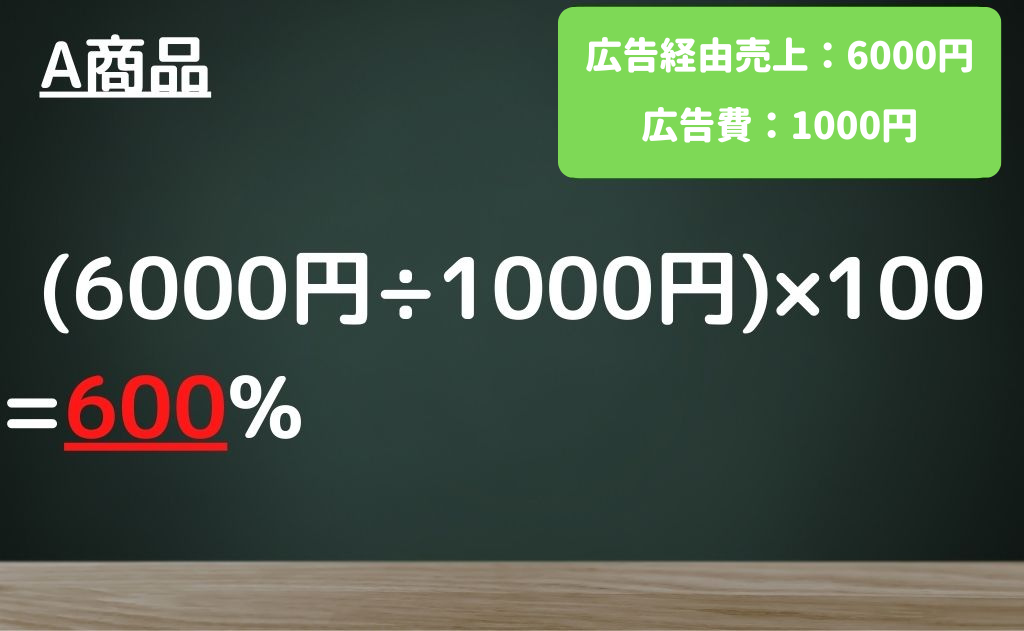 上記の定義に当てはめてみると、A商品は1000円の広告費をかけて行った広告が6000円という売上を生んだということなのでROAS600%です。