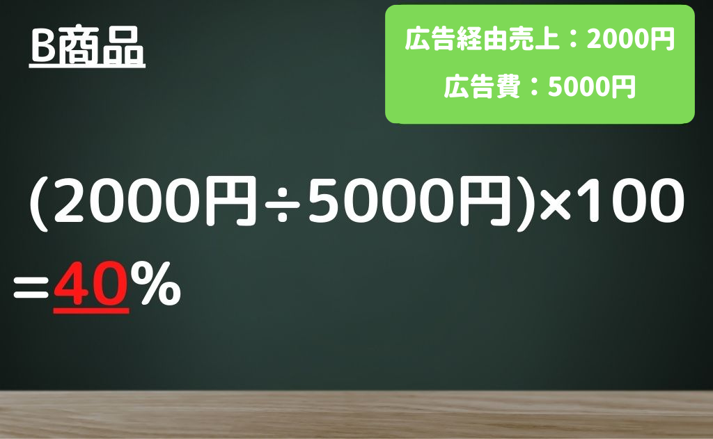 B商品は5000円の広告費をかけて行った広告が2000円の売上しか生まなかったということでROAS40%となります。