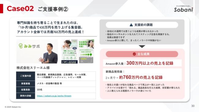 株式会社スリーエム様のご支援事例では、Amazon参入時にノウハウ不足や自社運用で成果が出ないという課題を抱えていました。そばには競合調査、新規商品登録、広告運用、セール施策、ページ画像ディレクション、レビュー対策まで一貫して支援させていただきました。