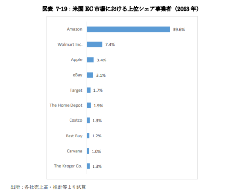 米国EC市場において、Amazonは圧倒的なトップシェアを誇ります。2023年のデータでは、Amazonの市場シェアは39.6%と推計されており、2位のWalmart(7.4%)を大きく引き離しています。AppleやeBay、Target、The Home Depotといった大手企業も続きますが、いずれもシェアは一桁台前半に留まっており、Amazonの独走状態が続いていることがわかります。