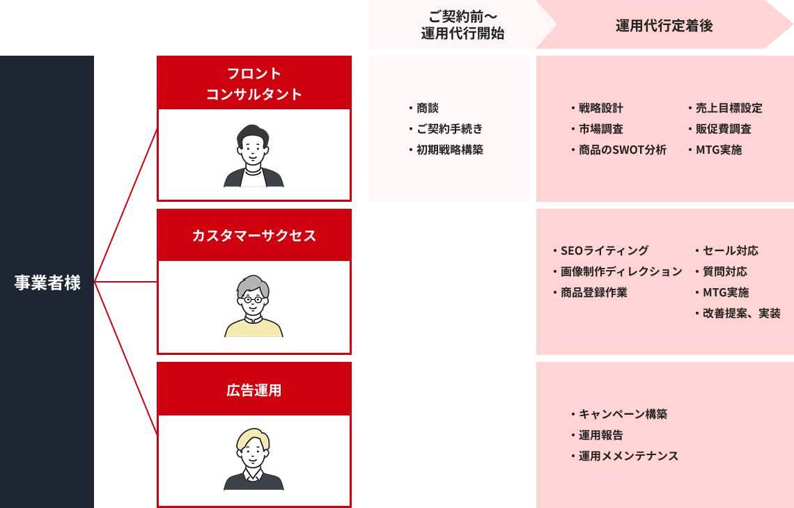 当社の支援体制はお客様の事業を確実に成長させるため、戦略立案から実行、効果検証までの各フェーズを分業体制で構築しており、